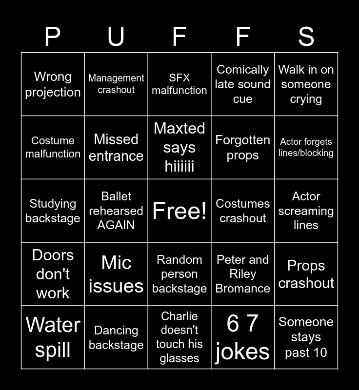 This bingo card has a free space and 27 words: Peter and Riley Bromance, Lost phone, Forgotten props, Charlie doesn't touch his glasses, Costume malfunction, SFX malfunction, Management crashout, Doors don't work, Costumes crashout, Props crashout, Studying backstage, Comically late sound cue, Water spill, Dancing backstage, Actor forgets lines/blocking, "QUIET BACKSTAGE", Missed entrance, Maxted says hiiiiii, Mic issues, Wrong projection, Actor screaming lines, 6 7 jokes, Ballet rehearsed AGAIN, Someone stays past 10, Random person backstage, Walk in on someone crying and Sleeping backstage.