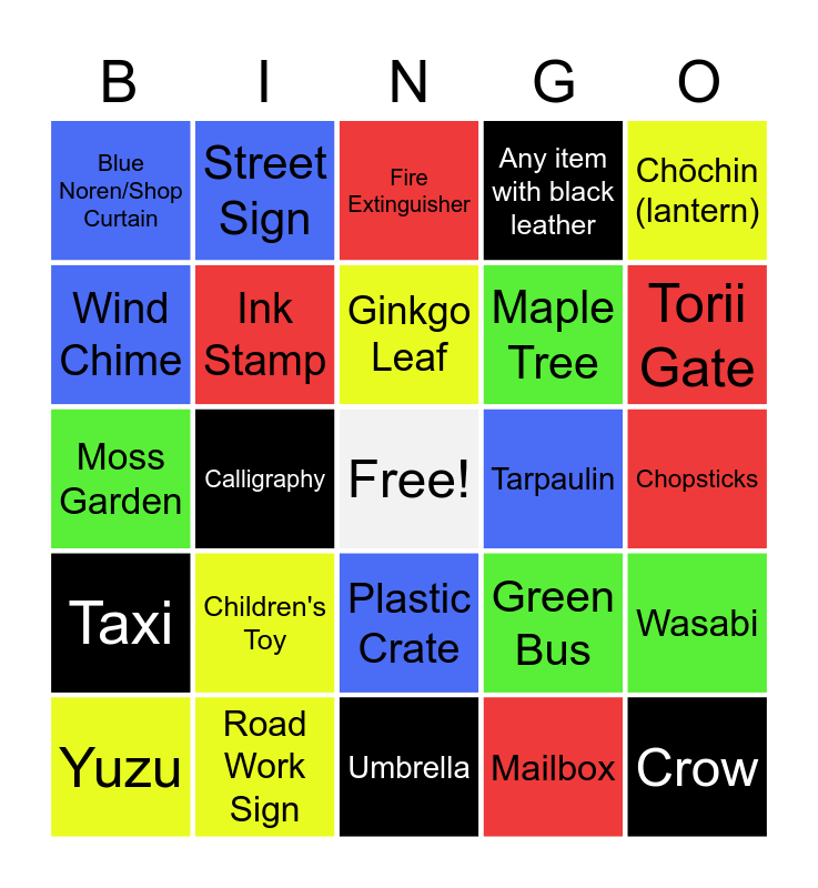 This bingo card has a free space and 24 words: Children's Toy, Road Work Sign, Ginkgo Leaf, Yuzu, Chōchin (lantern), Blue Noren/Shop Curtain, Wind Chime, Street Sign, Tarpaulin, Plastic Crate, Maple Tree, Moss Garden, Green Bus, Wasabi, Ink Stamp, Mailbox, Chopsticks, Fire Extinguisher, Torii Gate, Calligraphy, Crow, Taxi, Any item with black leather and Umbrella.
