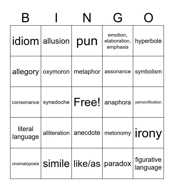 This bingo card has a free space and 24 words: alliteration, simile, metaphor, onomatopoeia, hyperbole, idiom, allegory, allusion, anaphora, anecdote, assonance, consonance, metonomy, irony, oxymoron, paradox, personification, pun, symbolism, synedoche, figurative language, literal language, emotion, elaboration, emphasis and like/as.