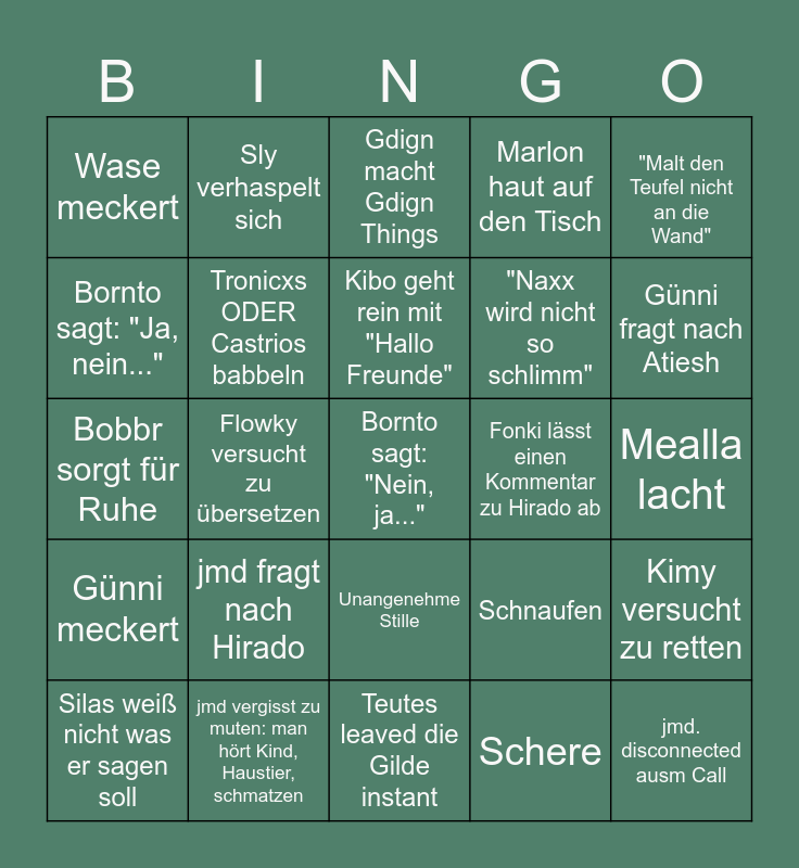 This bingo card has 25 words: Günni meckert, jmd vergisst zu muten: man hört Kind, Haustier, schmatzen, Bornto sagt: "Nein, ja...", Schere, "Malt den Teufel nicht an die Wand", Wase meckert, Sly verhaspelt sich, Gdign macht Gdign Things, Fonki lässt einen Kommentar zu Hirado ab, Kimy versucht zu retten, Bornto sagt: "Ja, nein...", Tronicxs ODER Castrios babbeln, Teutes leaved die Gilde instant, Schnaufen, Günni fragt nach Atiesh, Silas weiß nicht was er sagen soll, Flowky versucht zu übersetzen, Kibo geht rein mit "Hallo Freunde", "Naxx wird nicht so schlimm", Mealla lacht, Bobbr sorgt für Ruhe, jmd fragt nach Hirado, Unangenehme Stille, Marlon haut auf den Tisch and jmd. disconnected ausm Call.
