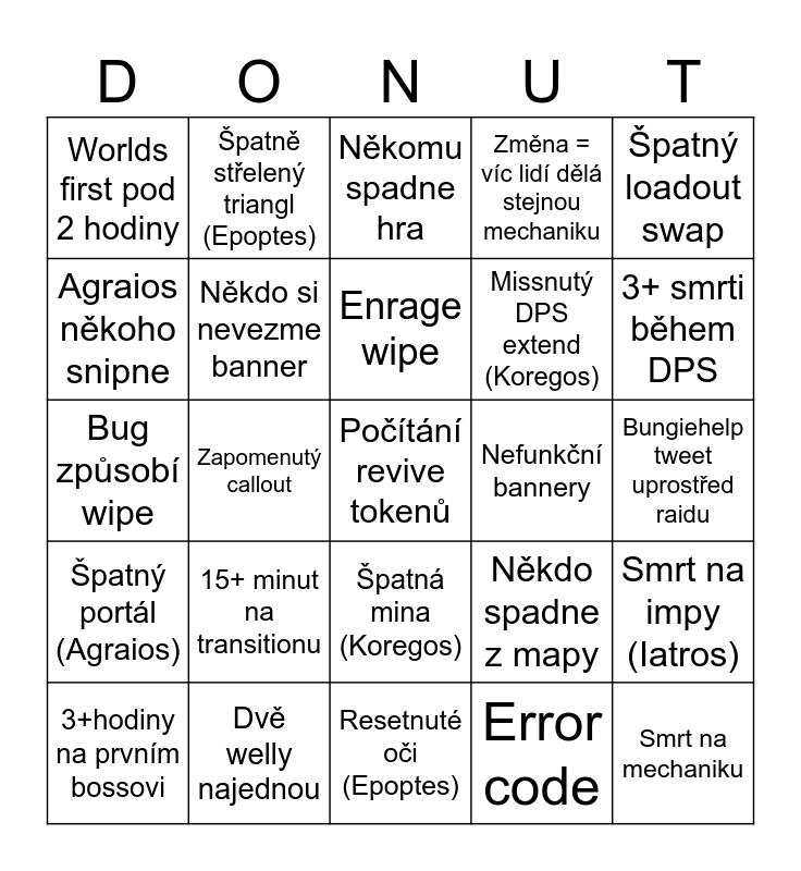 This bingo card has a free space and 24 words: 3+hodiny na prvním bossovi, 15+ minut na transitionu, Enrage wipe, Error code, Špatný loadout swap, Worlds first pod 2 hodiny, Špatně střelený triangl (Epoptes), Někomu spadne hra, Nefunkční bannery, Bungiehelp tweet uprostřed raidu, Bug způsobí wipe, Někdo si nevezme banner, Někdo spadne z mapy, Smrt na impy (Iatros), Agraios někoho snipne, Dvě welly najednou, Resetnuté oči (Epoptes), Změna = víc lidí dělá stejnou mechaniku, 3+ smrti během DPS, Špatný portál (Agraios), Zapomenutý callout, Špatná mina (Koregos), Missnutý DPS extend (Koregos) and Smrt na mechaniku.