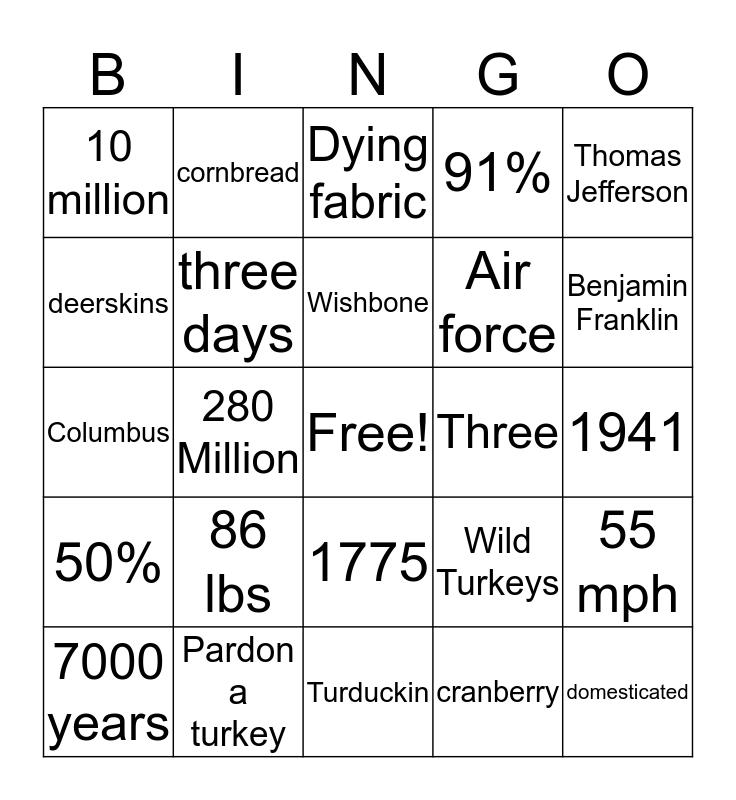 This bingo card has a free space and 24 words: 86 lbs, Pardon a turkey, Wishbone, 7000 years, Thomas Jefferson, 10 million, deerskins, cornbread, Three, 1775, Air force, Columbus, Wild Turkeys, 55 mph, three days, cranberry, 1941, Dying fabric, Benjamin Franklin, 280 Million, domesticated, 50%, 91% and Turduckin.