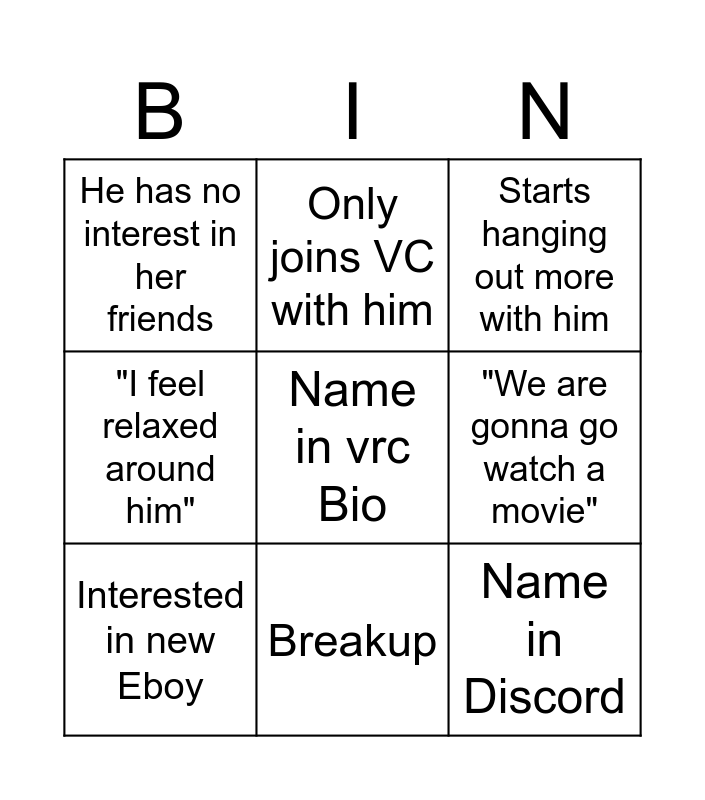 This bingo card has 9 words: Interested in new Eboy, Starts hanging out more with him, Only joins VC with him, "I feel relaxed around him", He has no interest in her friends, "We are gonna go watch a movie", Name in vrc Bio, Name in Discord and Breakup.