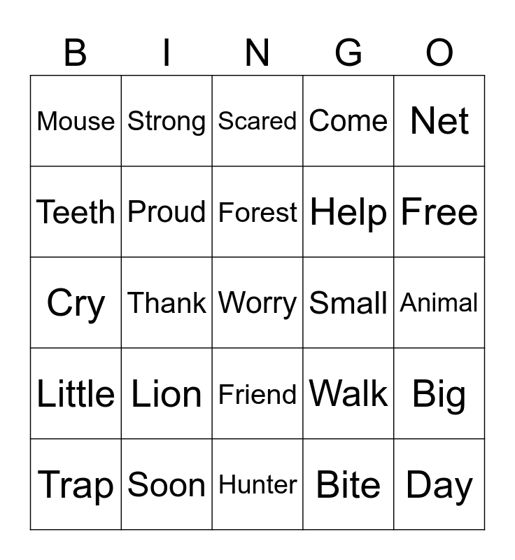 This bingo card has 25 words: Lion, Hunter, Forest, Trap, Net, Mouse, Teeth, Strong, Small, Friend, Help, Cry, Walk, Big, Proud, Day, Animal, Scared, Free, Thank, Worry, Soon, Little, Come and Bite.