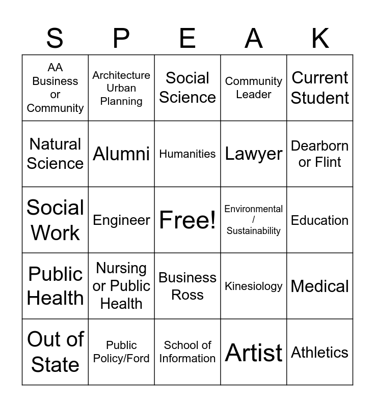 This bingo card has a free space and 24 words: Nursing or Public Health, Public Policy/Ford, Humanities, Out of State, Current Student, AA Business or Community, Natural Science, Architecture Urban Planning, Environmental / Sustainability, Business Ross, Lawyer, Social Work, Kinesiology, Medical, Alumni, Artist, Education, Social Science, Dearborn or Flint, Engineer, Athletics, Public Health, Community Leader and School of Information.