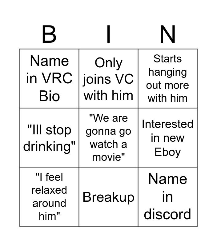 This bingo card has a free space and 8 words: Interested in new Eboy, Starts hanging out more with him, Only joins VC with him, "I feel relaxed around him", Name in VRC Bio, Name in discord, "Ill stop drinking" and Breakup.