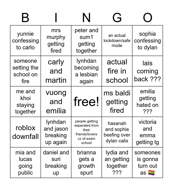 This bingo card has a free space and 24 words: lynhdan and jason breaking up again, daniel and suri breaking up, lynhdan becoming a lesbian again, mia and lucas going public, sophia confessing to dylan, yunnie confessing to carlo, someone setting the school on fire, mrs murphy getting fired, ms baldi getting fired, people getting seperated from their friends/lovers cz of exam school, actual fire in school, me and khoi staying together, hasanah and sophia beefing over dylan calix, victoria and emma getting tg, carly and martin, lydia and an getting together ???, emilia getting hated on ???, peter and sum1 getting together, lais coming back ???, vuong and emilia, someones is gonna turn out as 🏳️🌈, roblox downfall, an actual lockdown/safe mode and brianna gets a growth spurt.