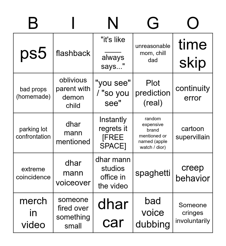 This bingo card has a free space and 25 words: dhar mann voiceover, dhar car, "you see" / "so you see", merch in video, time skip, ps5, bad props (homemade), flashback, random expensive brand mentioned or named (apple watch / dior), dhar mann studios office in the video, Plot prediction (real), parking lot confrontation, spaghetti, creep behavior, oblivious parent with demon child, kids with ipad, cartoon supervillain, "it's like ____ always says...", continuity error, dhar mann mentioned, Someone cringes involuntarily, someone fired over something small, extreme coincidence, unreasonable mom, chill dad and bad voice dubbing.