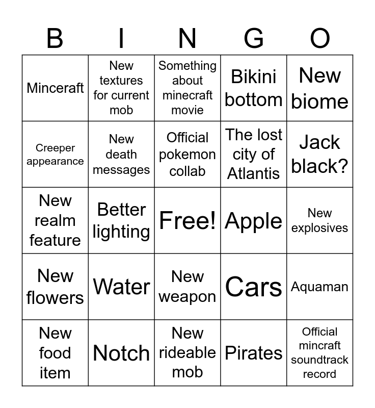 This bingo card has a free space and 24 words: Water, Notch, Official pokemon collab, New food item, New biome, Minceraft, Creeper appearance, New textures for current mob, Apple, New weapon, The lost city of Atlantis, New realm feature, Cars, Aquaman, New death messages, Pirates, New explosives, Something about minecraft movie, Jack black?, Better lighting, Official mincraft soundtrack record, New flowers, Bikini bottom and New rideable mob.