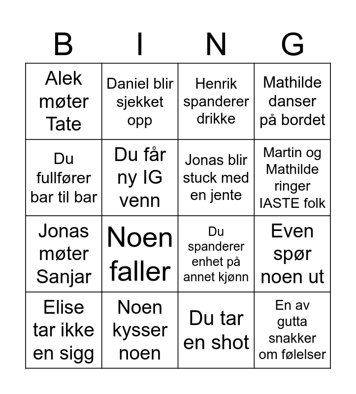 This bingo card has 16 words: Noen kysser noen, Even spør noen ut, Henrik spanderer drikke, Alek møter Tate, Jonas møter Sanjar, Daniel blir sjekket opp, Du spanderer enhet på annet kjønn, Du tar en shot, Du fullfører bar til bar, Du får ny IG venn, Elise tar ikke en sigg, Mathilde danser på bordet, Noen faller, Martin og Mathilde ringer IASTE folk, Jonas blir stuck med en jente and En av gutta snakker om følelser.