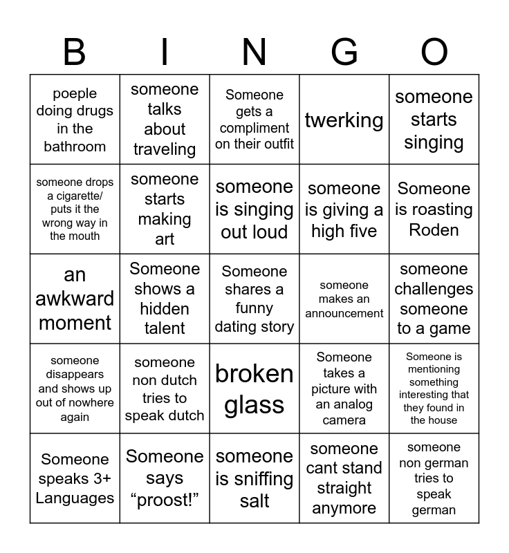 This bingo card has a free space and 29 words: Someone speaks 3+ Languages, poeple making out, Someone shows a hidden talent, someone wears two different socks, poeple doing drugs in the bathroom, Someone gets a compliment on their outfit, someone starts making art, someone non dutch tries to speak dutch, someone makes an announcement, Someone says “proost!”, someone challenges someone to a game, someone non german tries to speak german, someone is sniffing salt, someone cant stand straight anymore, Someone is roasting Roden, someone getting stupid drunk, broken glass, someone disappears and shows up out of nowhere again, someone starts singing, an awkward moment, Someone takes a picture with an analog camera, Alex says Broooo, someone is giving a high five, someone drops a cigarette/ puts it the wrong way in the mouth, twerking, someone talks about traveling, Someone is mentioning something interesting that they found in the house, someone is singing out loud and drinking game.