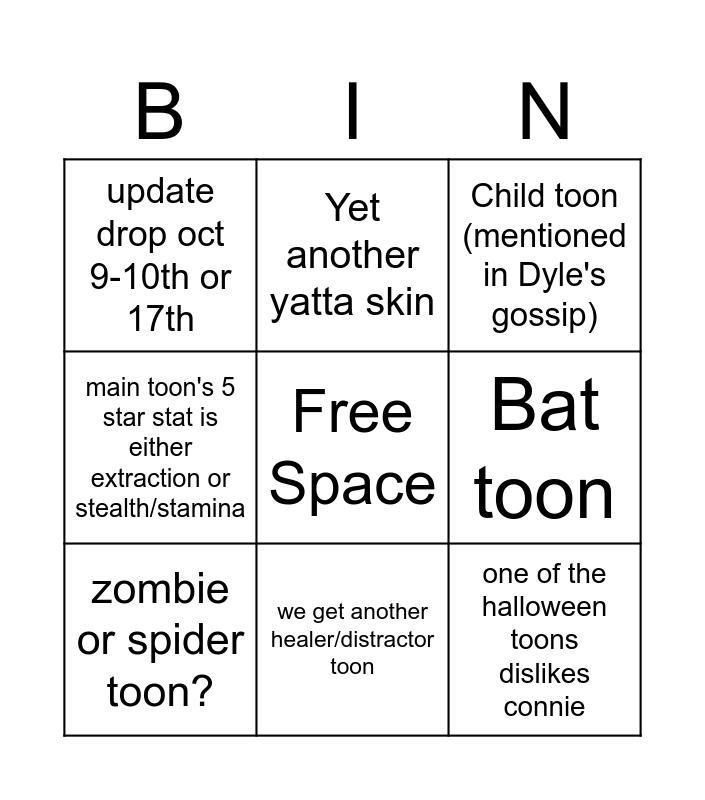 This bingo card has a free space and 8 words: Bat toon, Child toon (mentioned in Dyle's gossip), Yet another yatta skin, zombie or spider toon?, update drop oct 9-10th or 17th, one of the halloween toons dislikes connie, main toon's 5 star stat is either extraction or stealth/stamina and we get another healer/distractor toon.