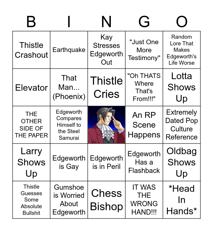 This bingo card has a free space and 24 words: Edgeworth is Gay, Gumshoe is Worried About Edgeworth, Thistle Cries, Thistle Guesses Some Absolute Bullshit, Random Lore That Makes Edgeworth's Life Worse, Thistle Crashout, Elevator, Earthquake, An RP Scene Happens, Edgeworth is in Peril, "Oh THATS Where That's From!!!", THE OTHER SIDE OF THE PAPER, Edgeworth Has a Flashback, Oldbag Shows Up, That Man... (Phoenix), IT WAS THE WRONG HAND!!!, Extremely Dated Pop Culture Reference, Kay Stresses Edgeworth Out, Lotta Shows Up, Edgeworth Compares Himself to the Steel Samurai, *Head In Hands*, Larry Shows Up, "Just One More Testimony" and Chess Bishop.