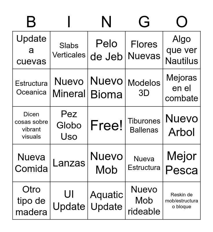 This bingo card has a free space and 24 words: Lanzas, UI Update, Nuevo Bioma, Otro tipo de madera, Algo que ver Nautilus, Update a cuevas, Estructura Oceanica, Slabs Verticales, Tiburones Ballenas, Nuevo Mob, Modelos 3D, Dicen cosas sobre vibrant visuals, Nueva Estructura, Mejor Pesca, Nuevo Mineral, Nuevo Mob rideable, Nuevo Arbol, Pelo de Jeb, Mejoras en el combate, Pez Globo Uso, Reskin de mob/estructura o bloque, Nueva Comida, Flores Nuevas and Aquatic Update.