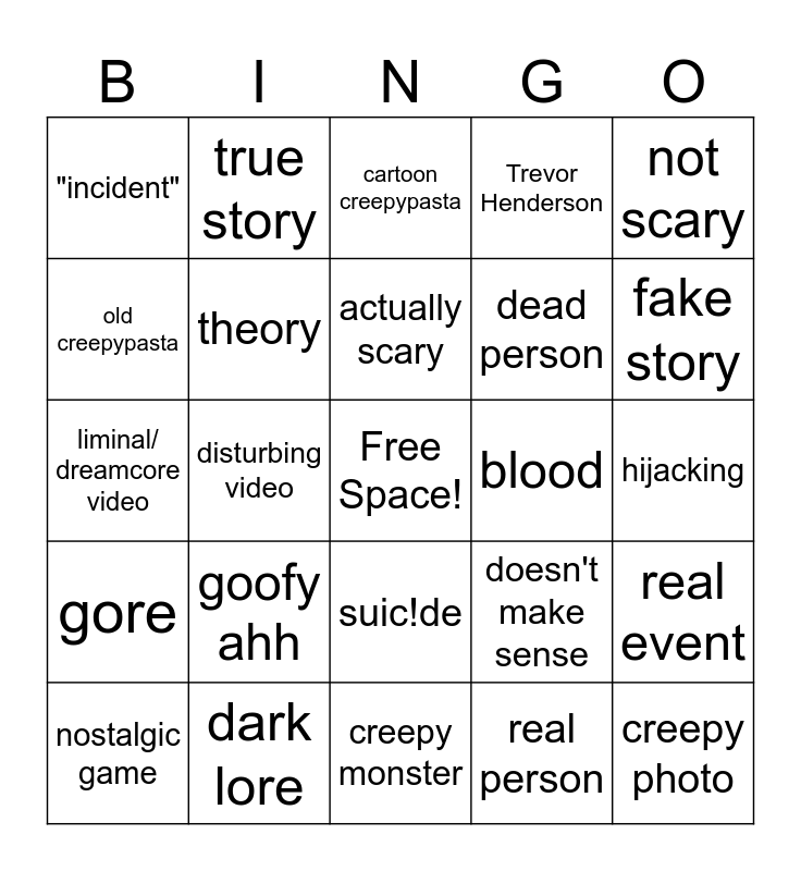 This bingo card has a free space and 24 words: goofy ahh, dark lore, actually scary, nostalgic game, not scary, "incident", old creepypasta, true story, blood, suic!de, dead person, liminal/ dreamcore video, doesn't make sense, real event, theory, real person, hijacking, cartoon creepypasta, fake story, disturbing video, creepy photo, gore, Trevor Henderson and creepy monster.
