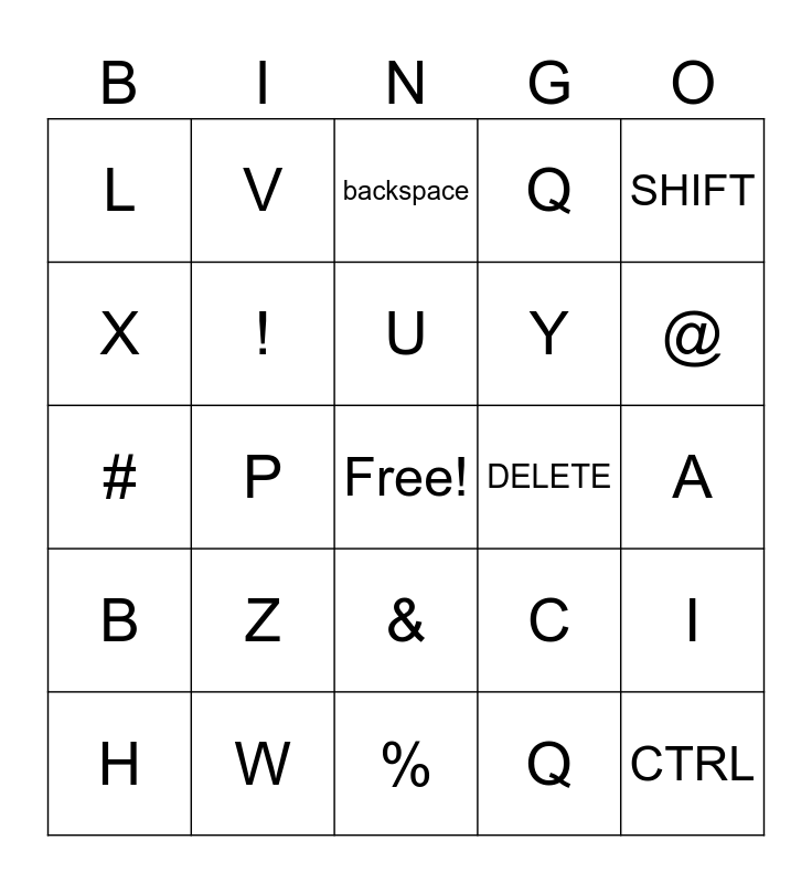 This bingo card has a free space and 44 words: Alt, CTRL, ENTER, H, T, Q, backspace, F, SHIFT, W, Q, DELETE, &, Z, $, %, G, #, D, @, V, J, N, L, ?, A, E, F, C, B, C, I, K, M, P, Q, R, S, U, X, Y, *, ! and Spacebar.