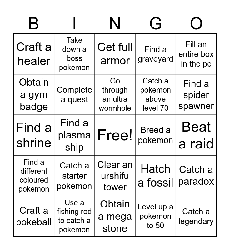 This bingo card has a free space and 24 words: Catch a starter pokemon, Use a fishing rod to catch a pokemon, Go through an ultra wormhole, Craft a pokeball, Fill an entire box in the pc, Craft a healer, Obtain a gym badge, Take down a boss pokemon, Breed a pokemon, Clear an urshifu tower, Catch a pokemon above level 70, Find a shrine, Hatch a fossil, Catch a paradox, Complete a quest, Level up a pokemon to 50, Beat a raid, Get full armor, Find a spider spawner, Find a plasma ship, Catch a legendary, Find a different coloured pokemon, Find a graveyard and Obtain a mega stone.