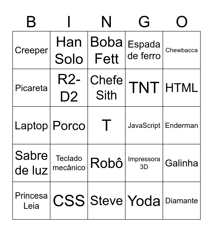 This bingo card has a free space and 34 words: Darth Vader, Yoda, Stormtrooper, Millennium Falcon, Sabre de luz, R2-D2, Chewbacca, Princesa Leia, Han Solo, BB-8, Chefe Sith, Boba Fett, Código bugado, Python, JavaScript, HTML, CSS, Laptop, Teclado mecânico, Impressora 3D, Robô, Inteligência Artificial, Creeper, Enderman, Steve, Diamante, Espada de ferro, Bloco de redstone, TNT, Picareta, Arco e flecha, Porco, Galinha and Nether.