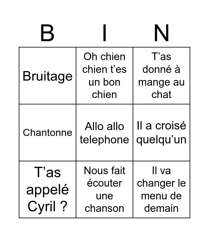 This bingo card has a free space and 8 words: Il a croisé quelqu’un, T’as donné à mange au chat, Oh chien chien t’es un bon chien, T’as appelé Cyril ?, Bruitage, Il va changer le menu de demain, Chantonne and Nous fait écouter une chanson.