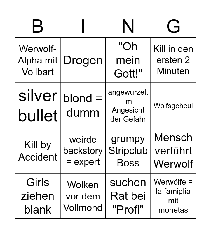 This bingo card has 16 words: Wolken vor dem Vollmond, Mensch verführt Werwolf, "Oh mein Gott!", Werwolf-Alpha mit Vollbart, Kill by Accident, Drogen, grumpy Stripclub Boss, suchen Rat bei "Profi", silver bullet, blond = dumm, Girls ziehen blank, Kill in den ersten 2 Minuten, weirde backstory = expert, Wolfsgeheul, angewurzelt im Angesicht der Gefahr and Werwölfe = la famiglia mit monetas.