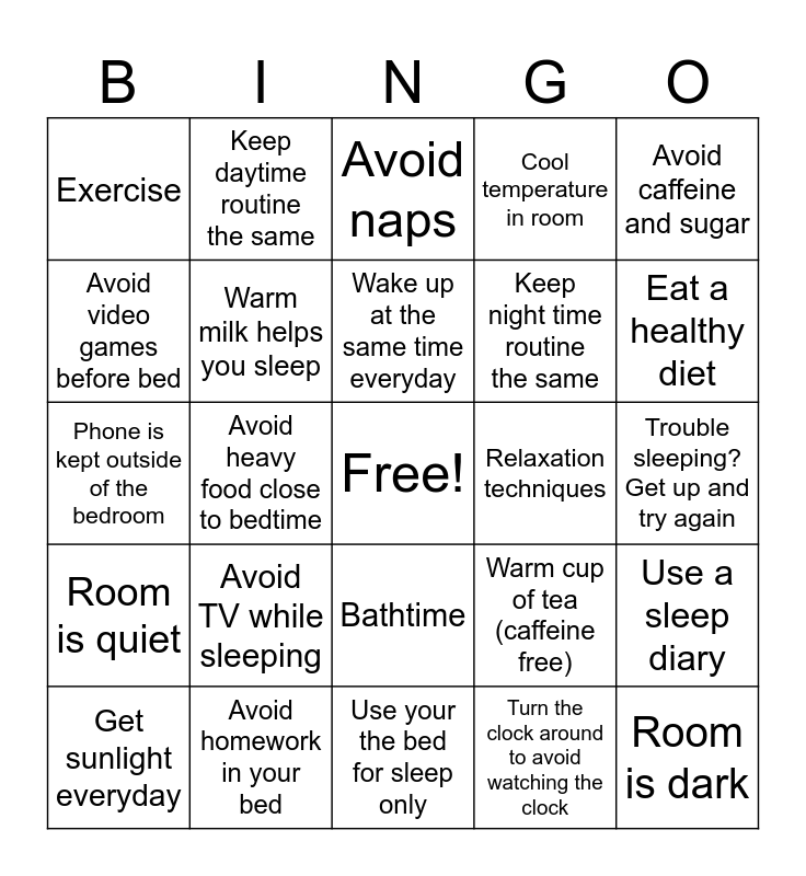 This bingo card has a free space and 26 words: Meditate, Avoid TV while sleeping, Use your the bed for sleep only, Turn the clock around to avoid watching the clock, Eat a healthy diet, Exercise, Keep daytime routine the same, Avoid naps, Keep night time routine the same, Use a sleep diary, Phone is kept outside of the bedroom, Avoid heavy food close to bedtime, Warm cup of tea (caffeine free), Room is dark, Room is quiet, Read a book, Wake up at the same time everyday, Relaxation techniques, Avoid caffeine and sugar, Get sunlight everyday, Warm milk helps you sleep, Bathtime, Cool temperature in room, Trouble sleeping? Get up and try again, Avoid video games before bed and Avoid homework in your bed.
