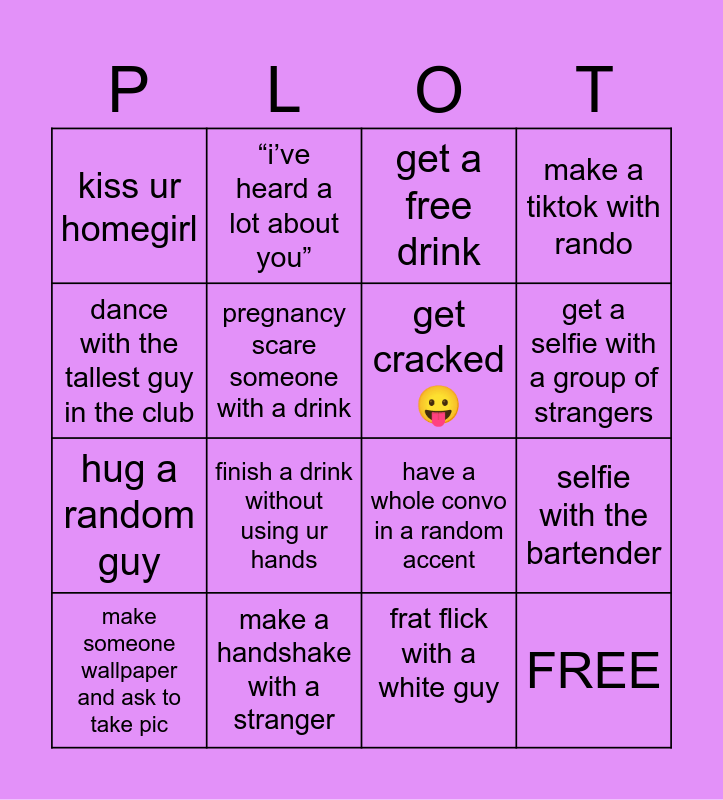 This bingo card has 16 words: make a handshake with a stranger, selfie with the bartender, get a free drink, kiss ur homegirl, hug a random guy, “i’ve heard a lot about you”, have a whole convo in a random accent, frat flick with a white guy, dance with the tallest guy in the club, pregnancy scare someone with a drink, make someone wallpaper and ask to take pic, make a tiktok with rando, finish a drink without using ur hands, get a selfie with a group of strangers, get cracked😛 and FREE.