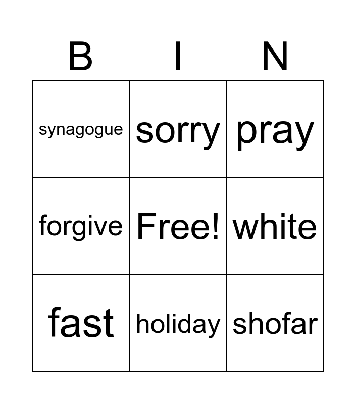 This bingo card has a free space and 9 words: fast, pray, sorry, forgive, synagogue, white, shofar, atone and holiday.
