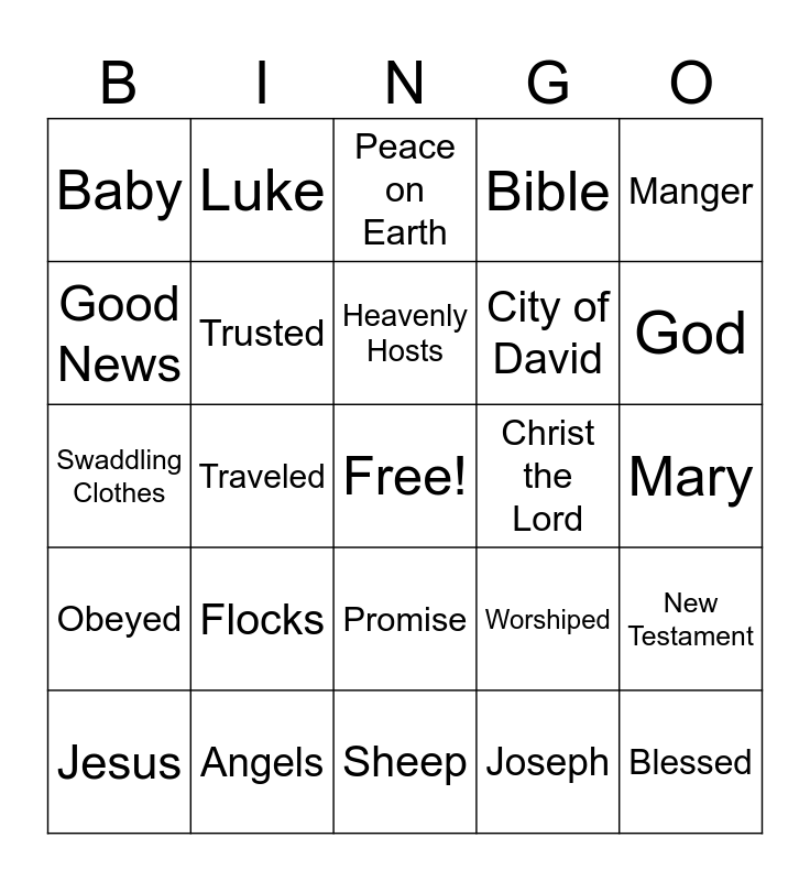 This bingo card has a free space and 29 words: Jesus, Savior, Traveled, Shepherds, Baby, Peace on Earth, Trusted, Flocks, Christ the Lord, Angels, Mary, Blessed, Sheep, Joseph, God, Bethlehem, Promise, Obeyed, Manger, Swaddling Clothes, Worshiped, Glory of the Lord, City of David, Good News, Bible, Luke, New Testament, Heavenly Hosts and Praising.
