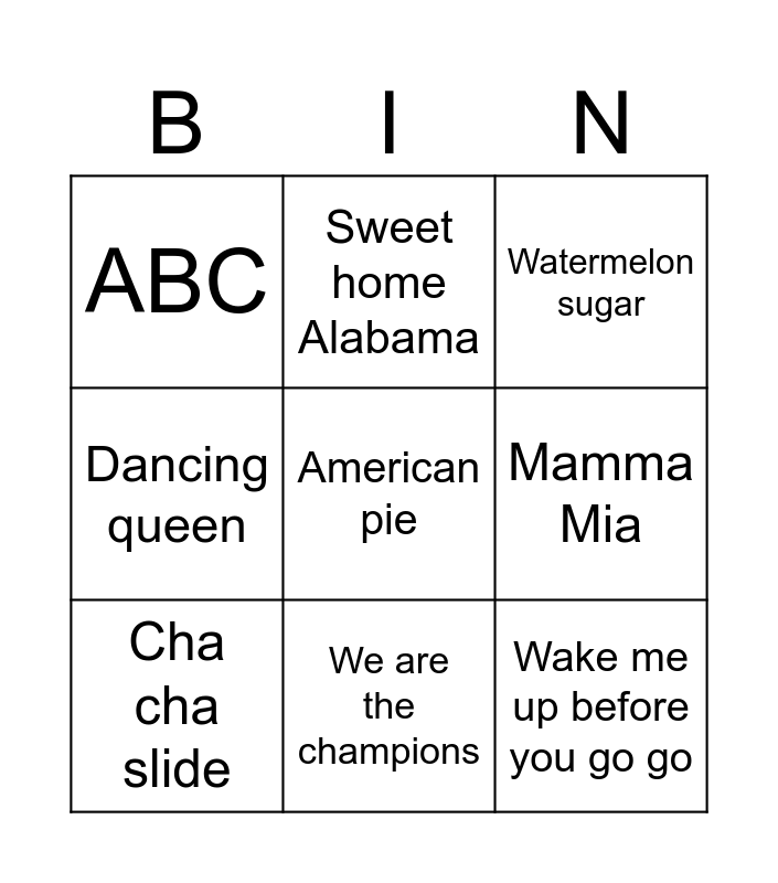 This bingo card has a free space and 14 words: Mambo.5, Macarena, Cha cha slide, Sweet home Alabama, Dancing queen, Wake me up before you go go, Staying alive, Don’t stop believing, We are the champions, ABC, Billie Jean, Mamma Mia, Watermelon sugar and Anaconda..