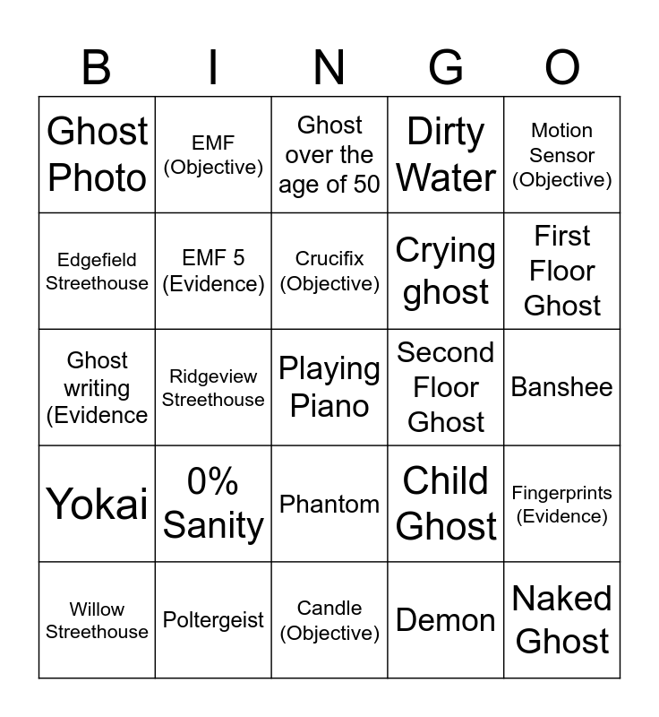 This bingo card has 37 words: Crawler, Shade, Basement or attic, EMF 5 (Evidence), Fingerprints (Evidence), 0% Sanity, Crucifix (Objective), Female Ghost, Motion Sensor (Objective), Smudge while hunting (Objective), Ridgeview Streethouse, Dirty Water, Playing Piano, Banshee, Edgefield Streethouse, Yokai, Bleasdale Farmhouse, Ghost over the age of 50, Phantom, Second Floor Ghost, Ghost Photo, First Floor Ghost, Willow Streethouse, Candle (Objective), Smudge Room (Objective), Demon, EMF (Objective), Male Ghost, Cleanse area near ghost (Objective), Escape ghost hunt (Objective), Witness a ghost event, Poltergeist, Ghost writing (Evidence, Naked Ghost, Child Ghost, Crying ghost and Mare.