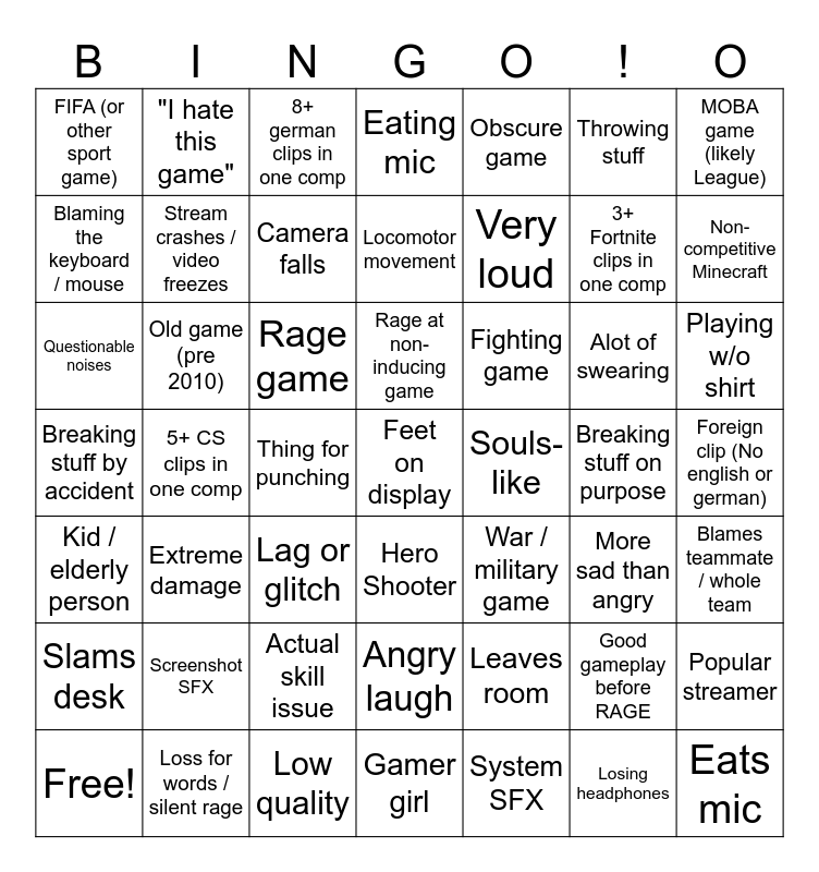 This bingo card has 49 words: Good gameplay before RAGE, 3+ Fortnite clips in one comp, System SFX, 5+ CS clips in one comp, Rage game, Foreign clip (No english or german), "I hate this game", Low quality, Throwing stuff, Hero Shooter, MOBA game (likely League), Eating mic, Alot of swearing, Fighting game, Screenshot SFX, Breaking stuff on purpose, Blaming the keyboard / mouse, Non-competitive Minecraft, Popular streamer, Obscure game, Very loud, Thing for punching, FIFA (or other sport game), Stream crashes / video freezes, Free!, Camera falls, Playing w/o shirt, Loss for words / silent rage, Rage at non-inducing game, Old game (pre 2010), Eats mic, Souls-like, Slams desk, Actual skill issue, Breaking stuff by accident, War / military game, More sad than angry, Blames teammate / whole team, Questionable noises, Lag or glitch, Angry laugh, Kid / elderly person, Feet on display, Gamer girl, Locomotor movement, 8+ german clips in one comp, Leaves room, Extreme damage and Losing headphones.