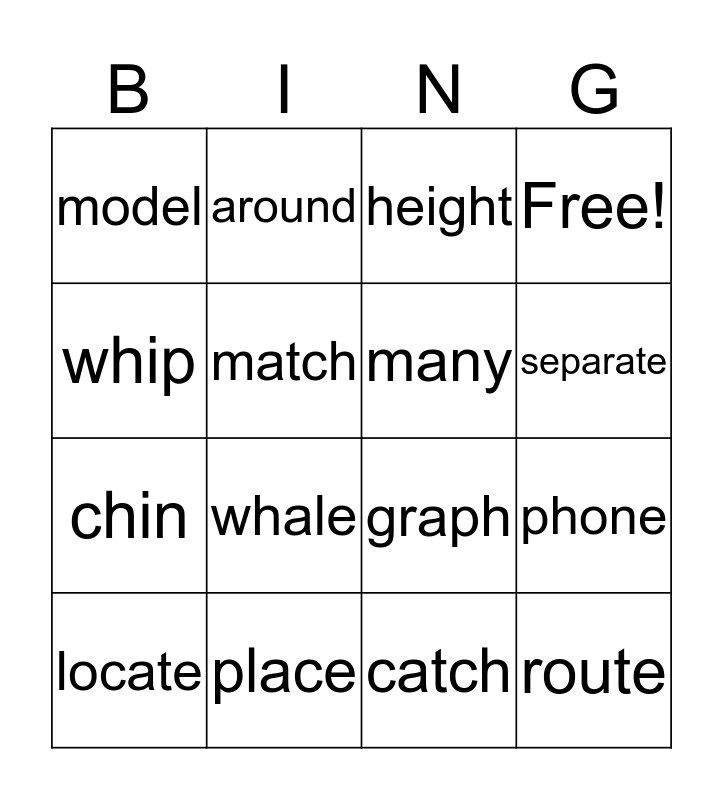 This bingo card has a free space and 15 words: locate, route, height, model, separate, whip, whale, catch, match, chin, phone, Free!, many, around and place.