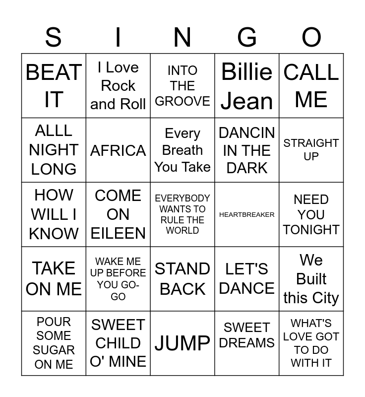 This bingo card has a free space and 29 words: POUR SOME SUGAR ON ME, LIVIN' ON A PRAYER, COME ON EILEEN, KARMA CHAMELEON, BEAT IT, INTO THE GROOVE, AFRICA, WAKE ME UP BEFORE YOU GO-GO, HEARTBREAKER, SWEET CHILD O' MINE, NEED YOU TONIGHT, WHAT'S LOVE GOT TO DO WITH IT, JUMP, SWEET DREAMS, STRAIGHT UP, HIGHER LOVE, STAND BACK, TAKE ON ME, CALL ME, HOW WILL I KNOW, LET'S DANCE, WHEN DOVES CRY, DANCIN IN THE DARK, ALLL NIGHT LONG, Billie Jean, I Love Rock and Roll, We Built this City, Every Breath You Take and White Wedding.