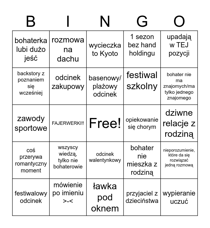 This bingo card has a free space and 24 words: wszyscy wiedzą, tylko nie bohaterowie, mówienie po imieniu >-<, basenowy/ plażowy odcinek, festiwalowy odcinek, upadają w TEJ pozycji, bohaterka lubi dużo jeść, backstory z poznaniem się wcześniej, rozmowa na dachu, opiekowanie się chorym, odcinek walentynkowy, festiwal szkolny, zawody sportowe, bohater nie mieszka z rodziną, nieporozumienie, które da się rozwiązać jedną rozmową, odcinek zakupowy, przyjaciel z dzieciństwa, dziwne relacje z rodziną, wycieczka to Kyoto, bohater nie ma znajomych/ma tylko jednego znajomego, FAJERWERKI!!, wypieranie uczuć, coś przerywa romantyczny moment, 1 sezon bez hand holdingu and ławka pod oknem.