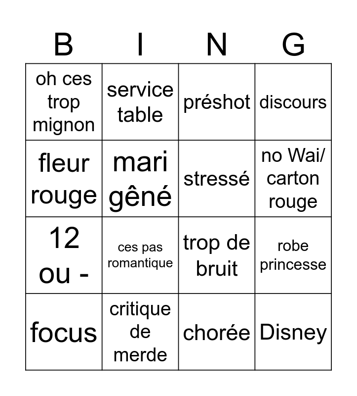 This bingo card has 16 words: critique de merde, robe princesse, préshot, oh ces trop mignon, 12 ou -, service table, trop de bruit, chorée, fleur rouge, mari gêné, focus, discours, ces pas romantique, no Wai/ carton rouge, stressé and Disney.
