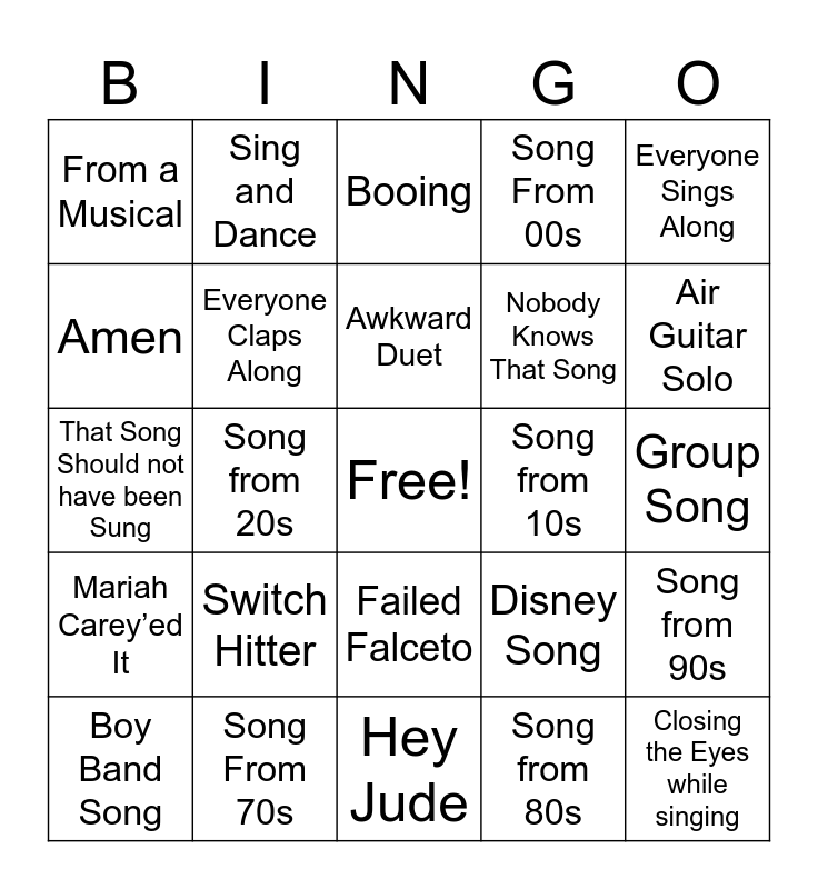 This bingo card has a free space and 24 words: Switch Hitter, Song From 70s, Awkward Duet, Boy Band Song, Everyone Sings Along, From a Musical, Amen, Sing and Dance, Song from 10s, Failed Falceto, Nobody Knows That Song, That Song Should not have been Sung, Disney Song, Song from 90s, Everyone Claps Along, Song from 80s, Group Song, Booing, Air Guitar Solo, Song from 20s, Closing the Eyes while singing, Mariah Carey’ed It, Song From 00s and Hey Jude.