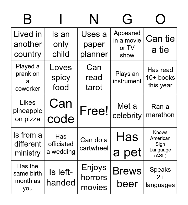 This bingo card has a free space and 29 words: Has the same birth month as you, Is currently a student, Can code, Drinks 3+ cups of coffee per day, Lived in another country, Uses a paper planner, Loves spicy food, Has officiated a wedding, Met a celebrity, Is left-handed, Ran a marathon, Speaks 2+ languages, Enjoys horrors movies, Brews beer, Has read 10+ books this year, Is a morning person, Can do a cartwheel, Is from a different ministry, Can tie a tie, Likes pineapple on pizza, Has a pet, Visited 4+ continents, Plays an instrument, Played a prank on a coworker, Appeared in a movie or TV show, Is an only child, Knows American Sign Language (ASL), Can read tarot and Gardens.