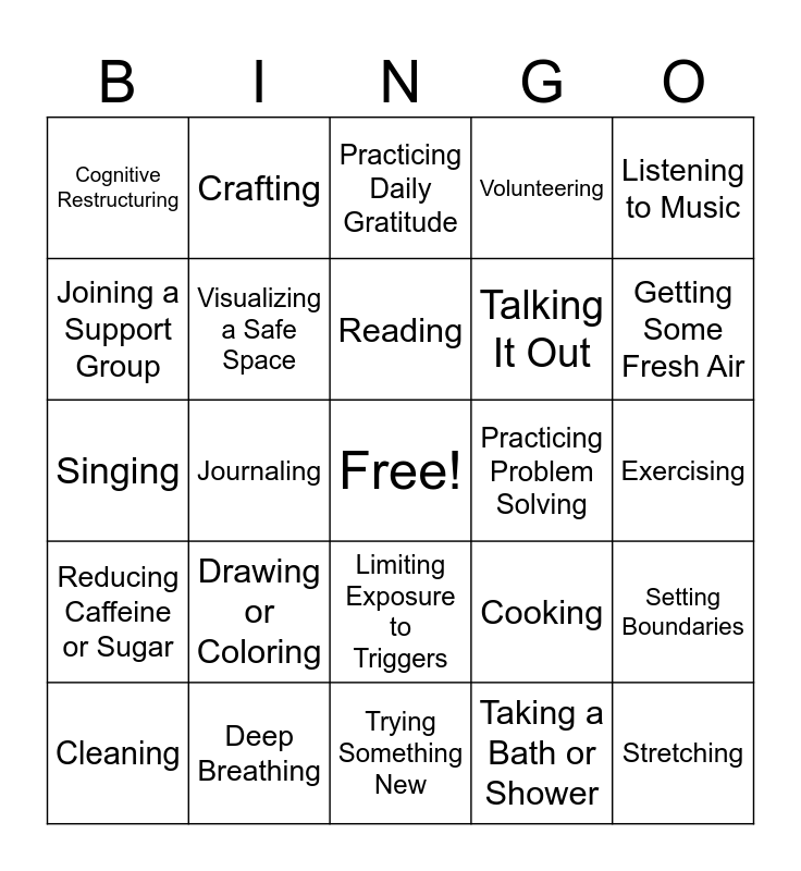 This bingo card has a free space and 30 words: Deep Breathing, Mindful Meditation, Journaling, Practicing Positive Self-Affirmations, Cognitive Restructuring, Practicing Daily Gratitude, Visualizing a Safe Space, Limiting Exposure to Triggers, Practicing Problem Solving, Trying Something New, Exercising, Stretching, Taking a Bath or Shower, Practicing Grounding Methods, Getting Some Fresh Air, Practicing Good Sleep Hygiene, Cooking, Reducing Caffeine or Sugar, Drawing or Coloring, Listening to Music, Singing, Writing, Crafting, Talking It Out, Joining a Support Group, Volunteering, Setting Boundaries, Cleaning, Reading and Practicing Forgiveness.