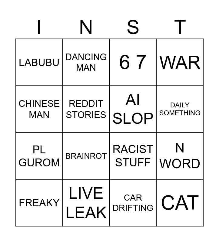 This bingo card has 16 words: LIVE LEAK, N WORD, 6 7, LABUBU, PL GUROM, DANCING MAN, RACIST STUFF, CAR DRIFTING, CHINESE MAN, REDDIT STORIES, FREAKY, WAR, BRAINROT, DAILY SOMETHING, AI SLOP and CAT.