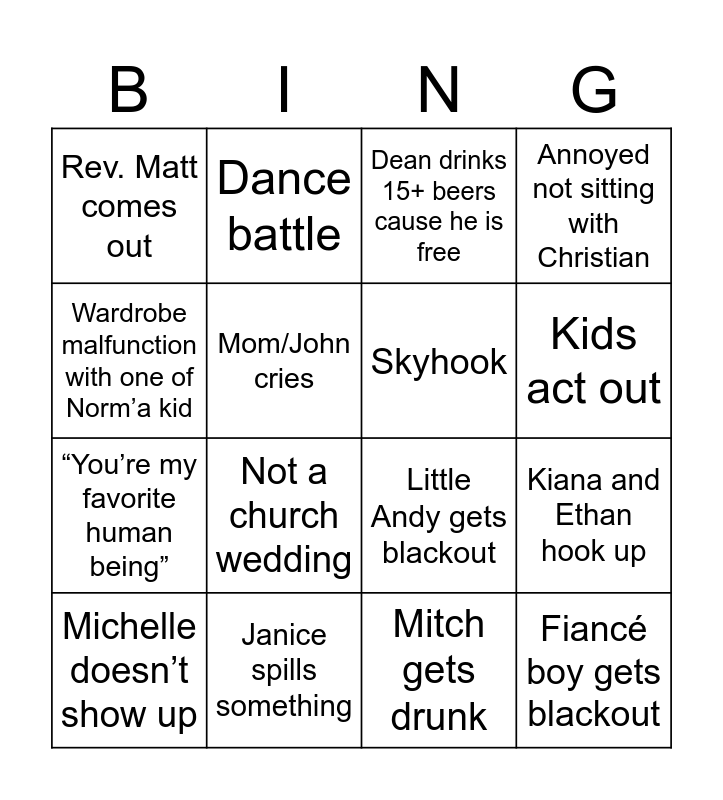 This bingo card has 16 words: Janice spills something, Kiana and Ethan hook up, Dean drinks 15+ beers cause he is free, Rev. Matt comes out, “You’re my favorite human being”, Dance battle, Little Andy gets blackout, Mitch gets drunk, Wardrobe malfunction with one of Norm’a kid, Mom/John cries, Michelle doesn’t show up, Annoyed not sitting with Christian, Not a church wedding, Kids act out, Skyhook and Fiancé boy gets blackout.