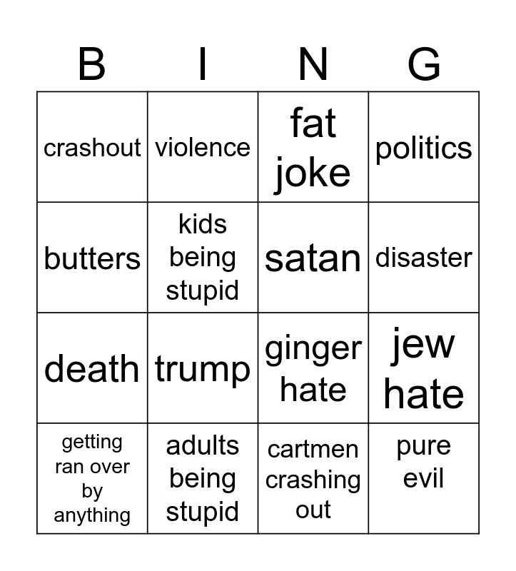 This bingo card has 16 words: adults being stupid, jew hate, fat joke, crashout, death, violence, ginger hate, cartmen crashing out, butters, kids being stupid, getting ran over by anything, politics, trump, disaster, satan and pure evil.