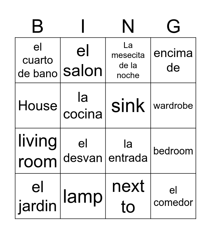 This bingo card has 22 words: living room, el tenedor, sink, el comedor, el cuarto de bano, la cocina, La mesecita de la noche, encima de, House, lamp, next to, wardrobe, el jardin, mirror, el atico, juguetes, el desvan, el dormitorio, bedroom, el salon, la entrada and cuarto.