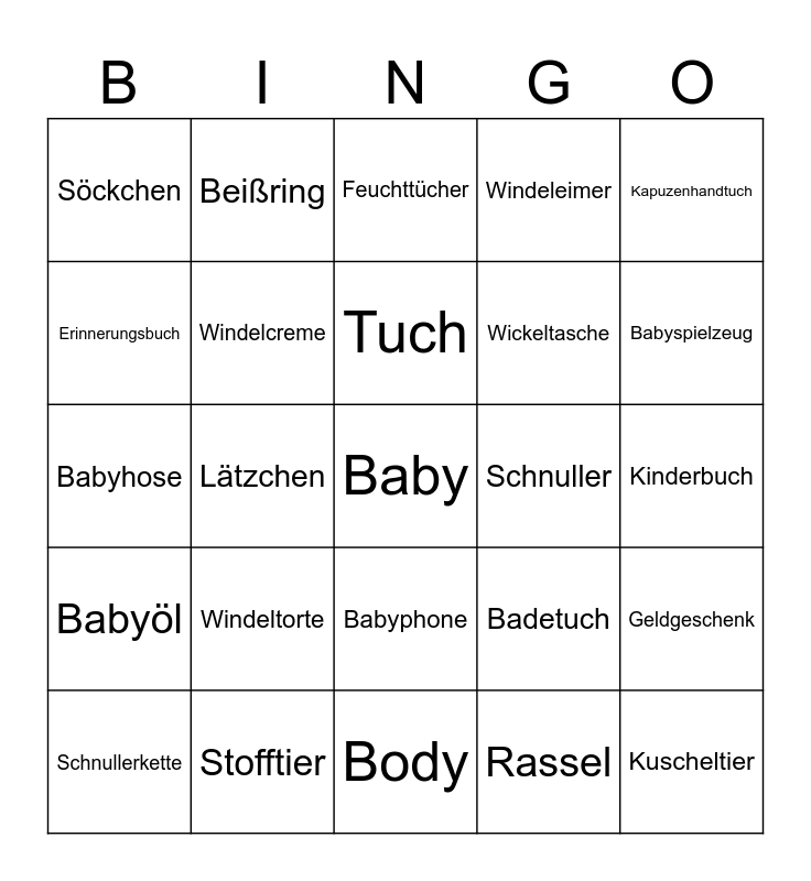 This bingo card has a free space and 31 words: Body, Windeln, Lätzchen, Mütze, Söckchen, Feuchttücher, Windelcreme, Badetuch, Schnuller, Rassel, Kinderbuch, Kuscheltier, Krabbeldecke, Wickelunterlage, Babyspielzeug, Gutschein, Geldgeschenk, Windeltorte, Babyöl, Babyphone, Kapuzenhandtuch, Fläschchen, Schnullerkette, Beißring, Wickeltasche, Erinnerungsbuch, Windeleimer, Babyhose, Stofftier, Tuch and Baby.