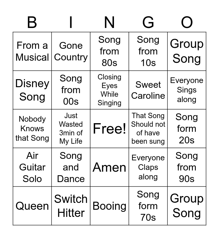 This bingo card has a free space and 24 words: Song and Dance, Switch Hitter, Closing Eyes While Singing, Queen, Group Song, From a Musical, Disney Song, Gone Country, That Song Should not of have been sung, Amen, Sweet Caroline, Nobody Knows that Song, Everyone Claps along, Song from 90s, Song from 00s, Song form 70s, Song form 20s, Song from 80s, Everyone Sings along, Just Wasted 3min of My Life, Group Song, Air Guitar Solo, Song from 10s and Booing.