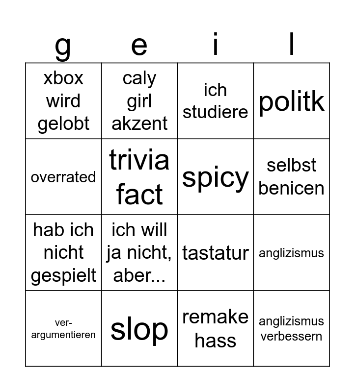 This bingo card has 16 words: slop, anglizismus, ich studiere, xbox wird gelobt, hab ich nicht gespielt, caly girl akzent, tastatur, remake hass, overrated, trivia fact, ver-argumentieren, politk, ich will ja nicht, aber..., selbst benicen, spicy and anglizismus verbessern.