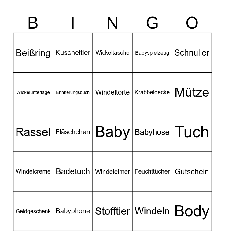 This bingo card has a free space and 30 words: Babyphone, Kapuzenhandtuch, Fläschchen, Schnullerkette, Beißring, Wickeltasche, Erinnerungsbuch, Windeleimer, Babyhose, Stofftier, Tuch, Body, Windeln, Lätzchen, Mütze, Söckchen, Feuchttücher, Windelcreme, Badetuch, Schnuller, Rassel, Kinderbuch, Kuscheltier, Krabbeldecke, Wickelunterlage, Babyspielzeug, Gutschein, Geldgeschenk, Windeltorte and Babyöl.