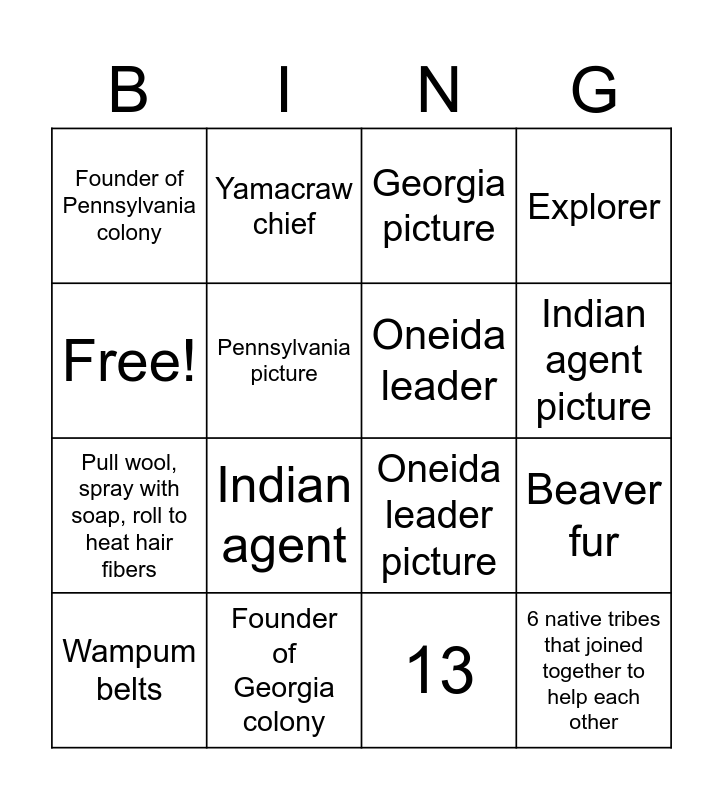 This bingo card has 16 words: Founder of Georgia colony, Beaver fur, Georgia picture, Founder of Pennsylvania colony, Pull wool, spray with soap, roll to heat hair fibers, Yamacraw chief, Oneida leader picture, 13, Free!, Pennsylvania picture, Wampum belts, Explorer, Indian agent, Indian agent picture, Oneida leader and 6 native tribes that joined together to help each other.