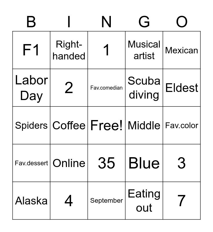 This bingo card has a free space and 24 words: Online, 4, Fav.comedian, Alaska, Mexican, F1, Labor Day, Right-handed, Middle, 35, Scuba diving, Spiders, Blue, 3, 2, Eating out, Fav.color, 1, Eldest, Coffee, 7, Fav.dessert, Musical artist and September.