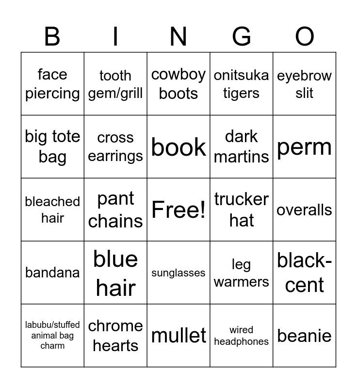 This bingo card has a free space and 24 words: blue hair, chrome hearts, book, labubu/stuffed animal bag charm, eyebrow slit, face piercing, big tote bag, tooth gem/grill, trucker hat, sunglasses, dark martins, bleached hair, leg warmers, black-cent, cross earrings, wired headphones, overalls, cowboy boots, perm, pant chains, beanie, bandana, onitsuka tigers and mullet.