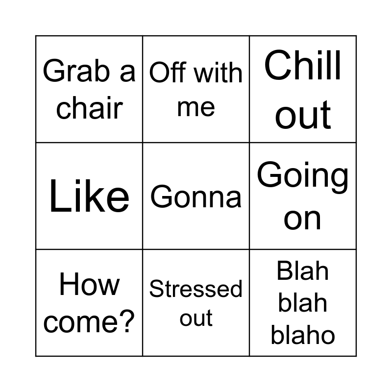 This bingo card has 14 words: Rip-off, Wanna, How come?, Off with me, Like, Gonna, Blah blah blaho, What’s up, Stressed out, Grab a chair, Doing my head in, Going on, Chill out and All right?.